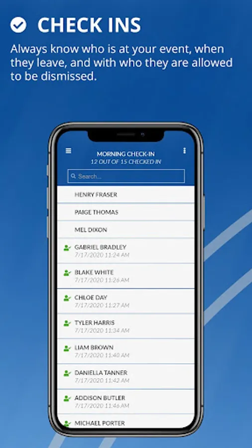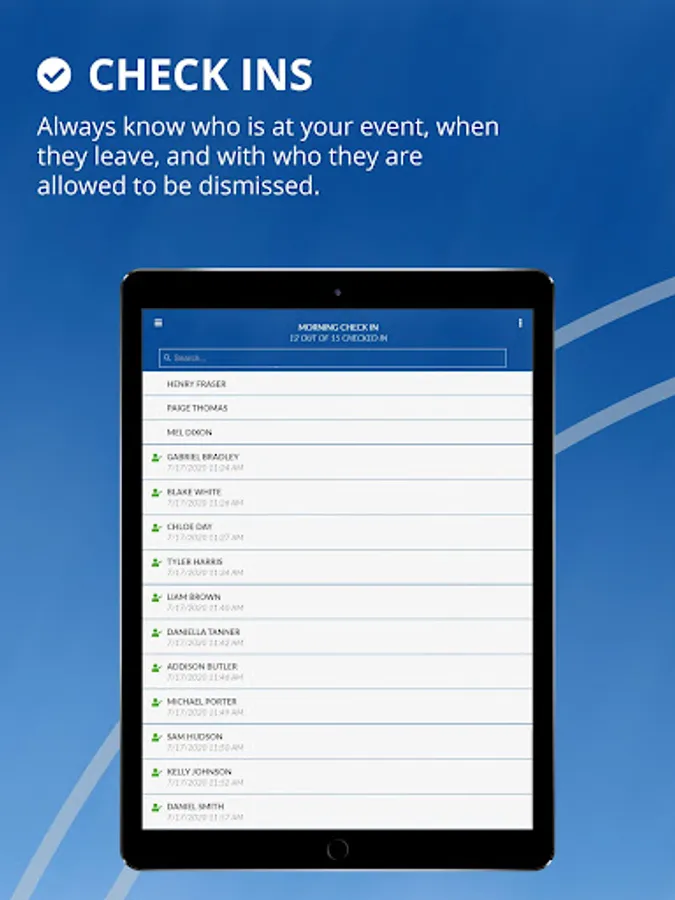 CHECK INS: Always know who is at your event, when they leave, and with who they are allowed to be dismissed.
