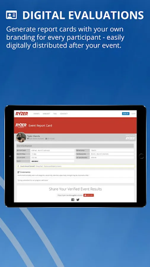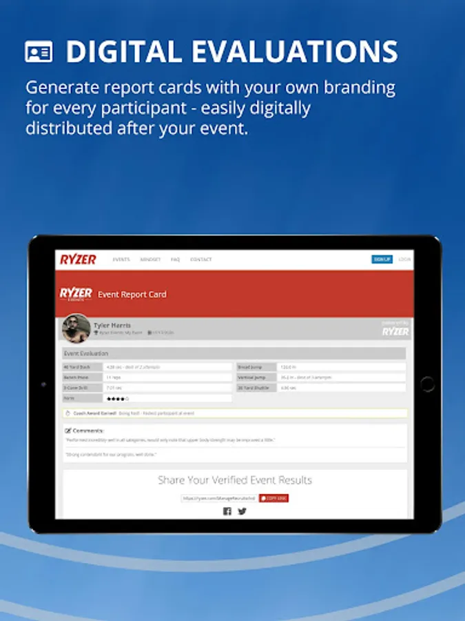 DIGITAL EVALUATIONS: Generate report cards with your own branding for every participant - easily digitally distributed after your event.