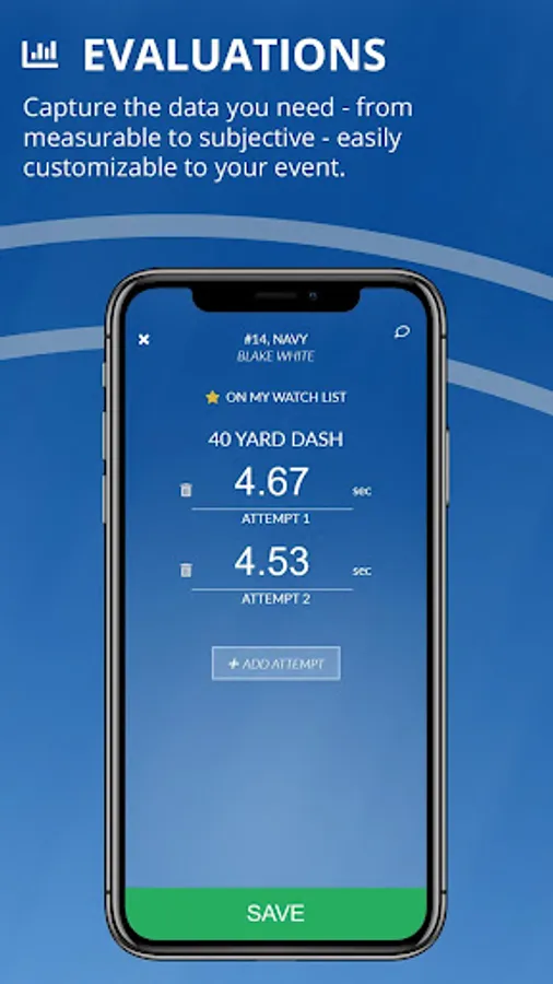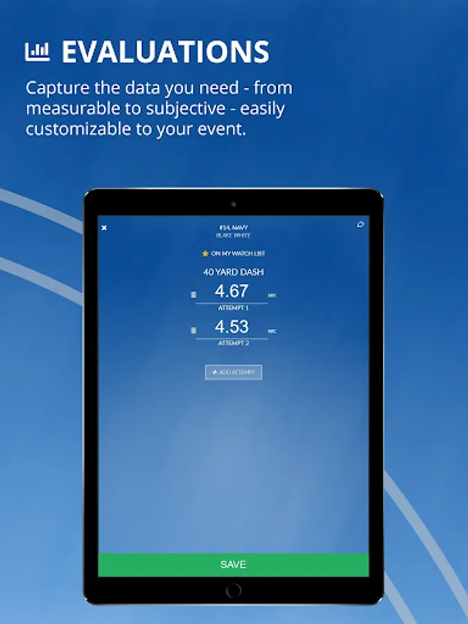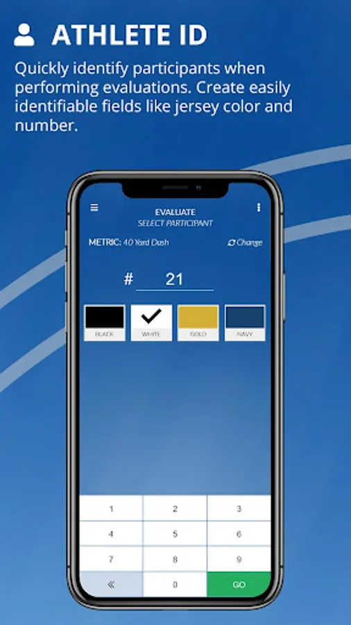 PARTICIPANT IDENTIFICATION: Quickly identify participants when performing evaluations. Create easily identifiable fields like jersey color and number.