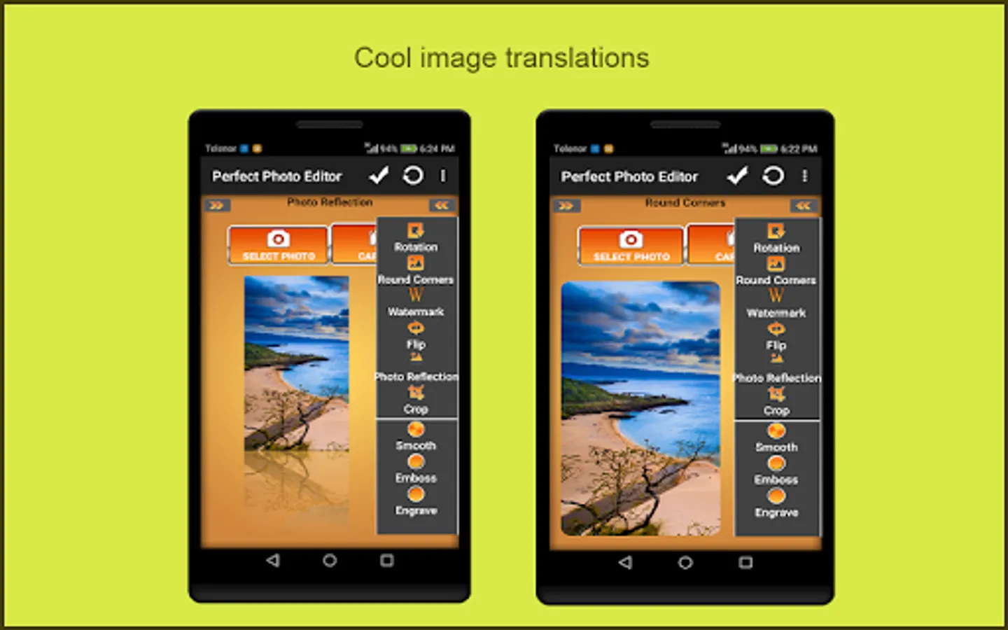 - Addition of translation effects to your photo like rotation, cropping, rounded corners, watermarking, highlighting, reflection etc.
