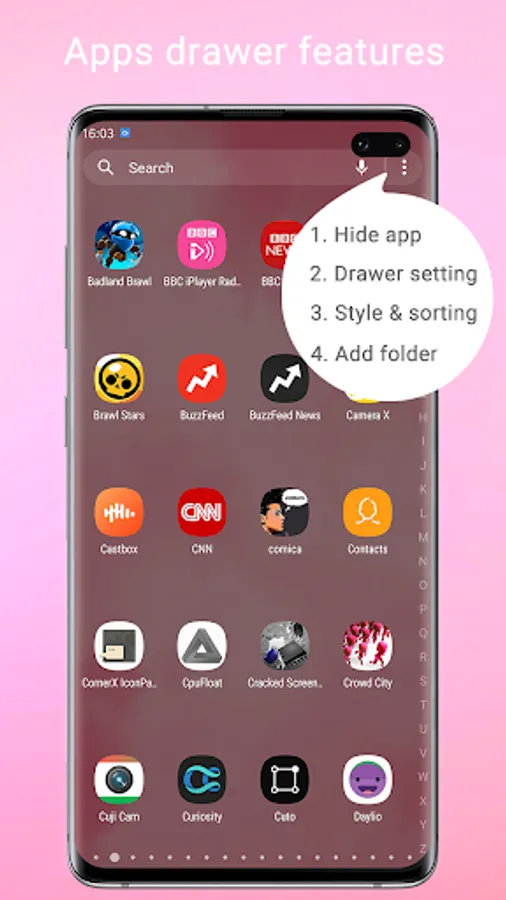* You get Galaxy S10 style launcher drawer, there are horizontal style or vertical style for your choice