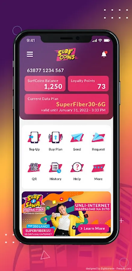 Ang SurfCoins App ay ginagamit pang top-up, manage, at monitor ng iyong Surf2Sawa Prepaid Fiber account.