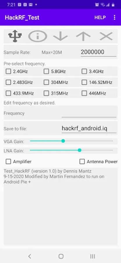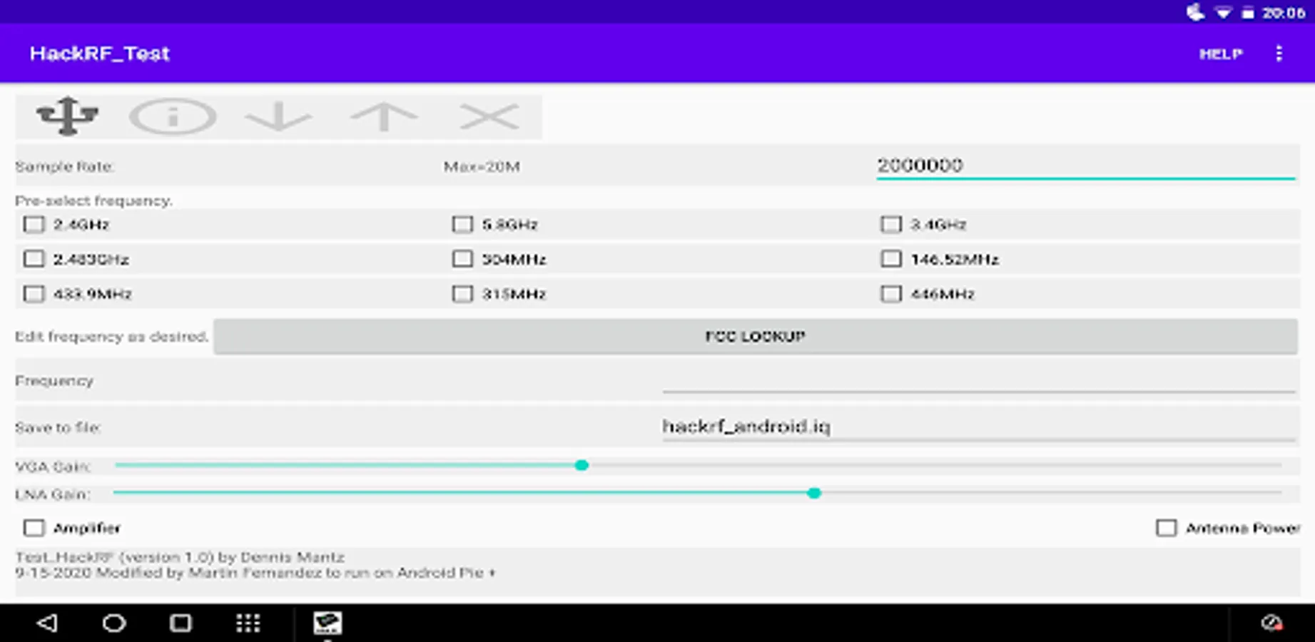 Plug the HackRF into the USB port and use this app to capture and replay signals from frequencies within the range of 1 Mhz to 6 Ghz. The original source code came from Dennis Mantz at https://github.com/demantz/hackrf_android. This version includes GUI buttons and preselected frequency options, as well as , targets the Android SDK 25 and greater. In order to transmit, uncheck amplifier, check antenna power, turn the LNA slider all the way down and turn the VGA all the way up.