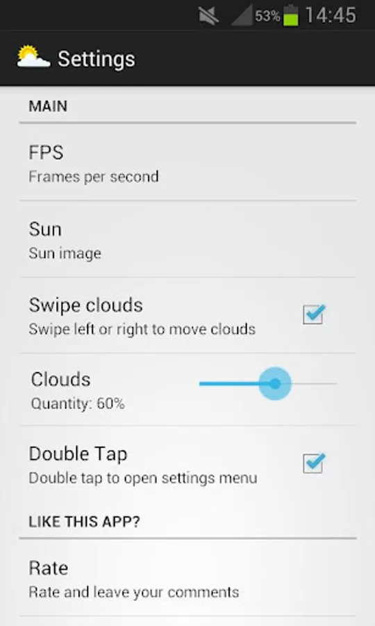Summer weather with beautiful sun and clouds. Sun rotating and gives you happiness. Clouds are moving across the screen and give a feeling of freshness with clear blue sky. You can customize quantity of clouds for your device screen.