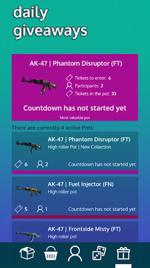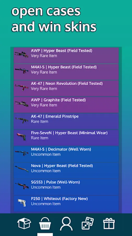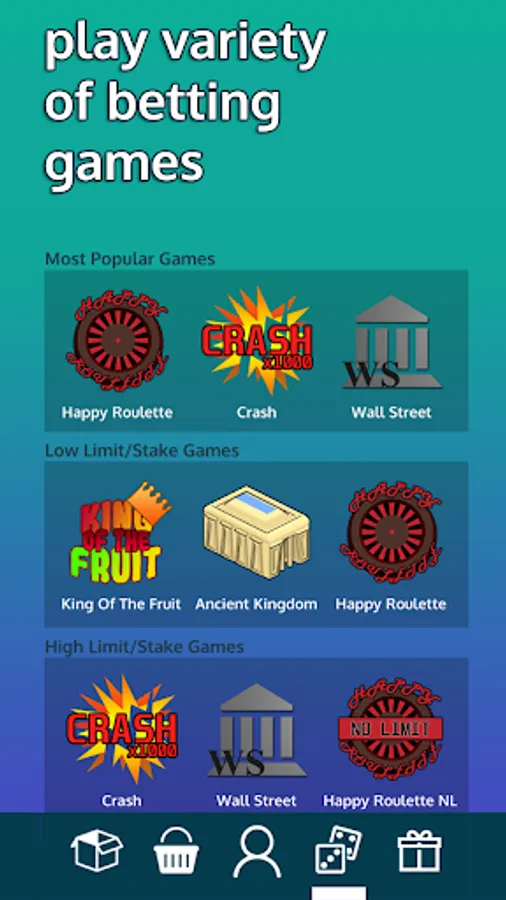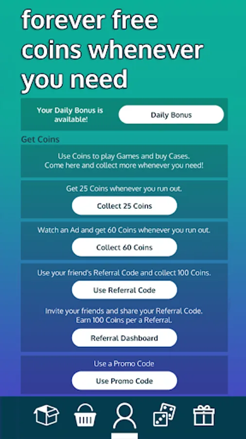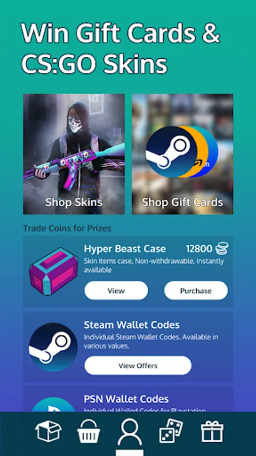 Users play Betting Games using an in-app Currency (COINS). The goal is to collect as many Coins as possible and trade those Coins for CS:GO Skins or Gift Cards.