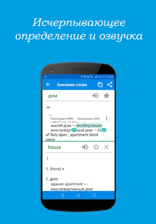 Tired of carrying large and heavy dictionaries with you? Now everything you need will be in your smartphone! Large English-Russian and Russian-English offline dictionaries will always be with you, wherever you are - studying, traveling or studying English at home. The dictionary contains about 190 thousand commonly used and specialized words!