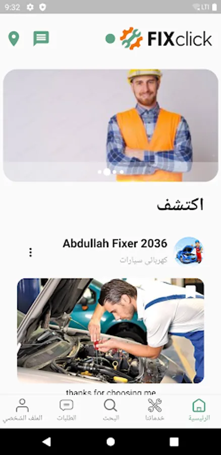 تطبيق FIXclick هو تطبيق يسهل البحث والربط بين مقدمي الخدمة ( الفنيين ) وطالبي الخدمة (عميل) ومن خلال التطبيق يستطيع طالبي الخدمة طلب خدمات مقدمي الخدمة والتواصل معه من خلال شات فوري