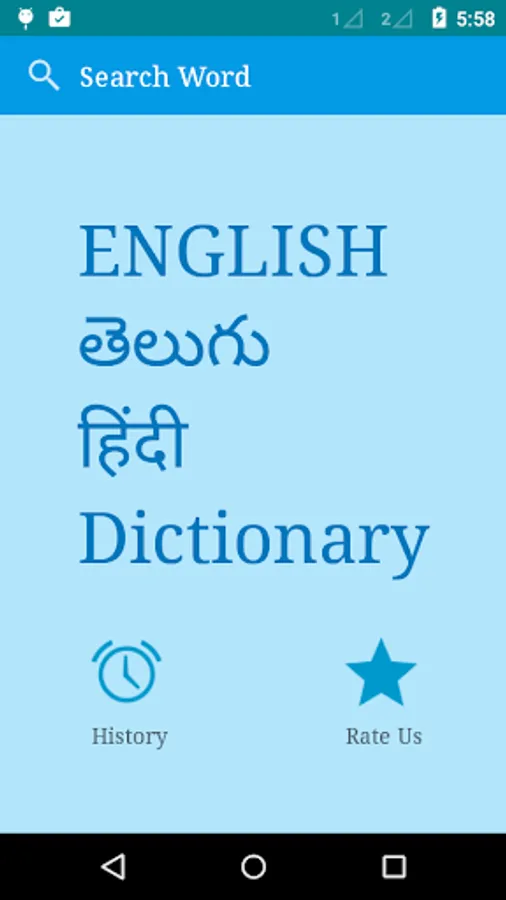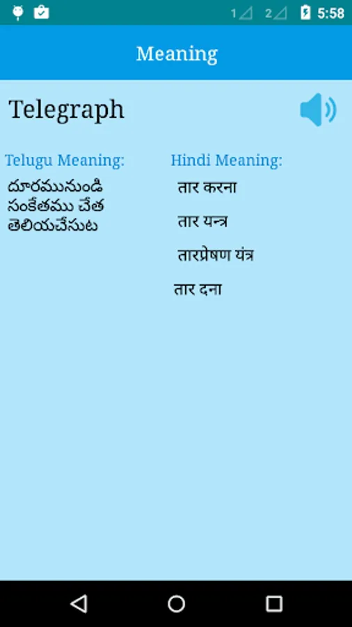 This dictionary provides meanings of English words in Telugu and Hindi.
