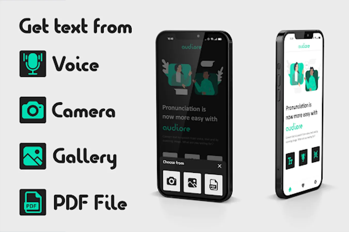 Audiore is a quick tool to reach out to when in doubt. Simply enter the text and you will hear a pronunciation of the word. Also you can take a picture of a text from camera to pronounce it. Not only picture, you can choose an image from gallery to pronounce and also you can speech a text from by getting from PDF. Learn the different pronunciations of words in 60+ Accents of the world.