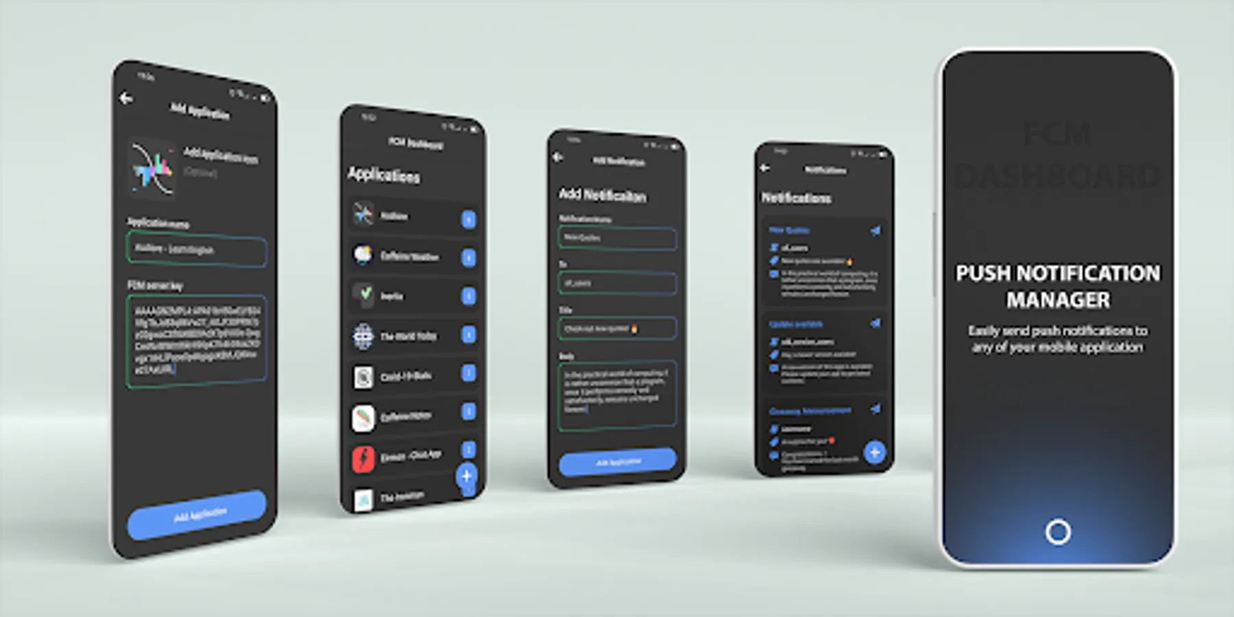 The ultimate Firebase Push Notification and Firebase Cloud Messaging app, for all developers. Manage daily weekly notifications for your users of your applications from FCM Dashboard. The app has an smooth UI so you will not get bored while using it.