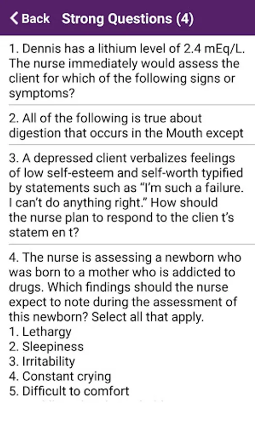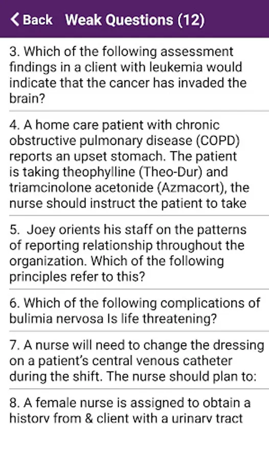 NCLEX-RN Quiz App Gives you an awesome features called Strong & Weak Questions for you to check what are the STRONG & WEAK Questions depends on your score.