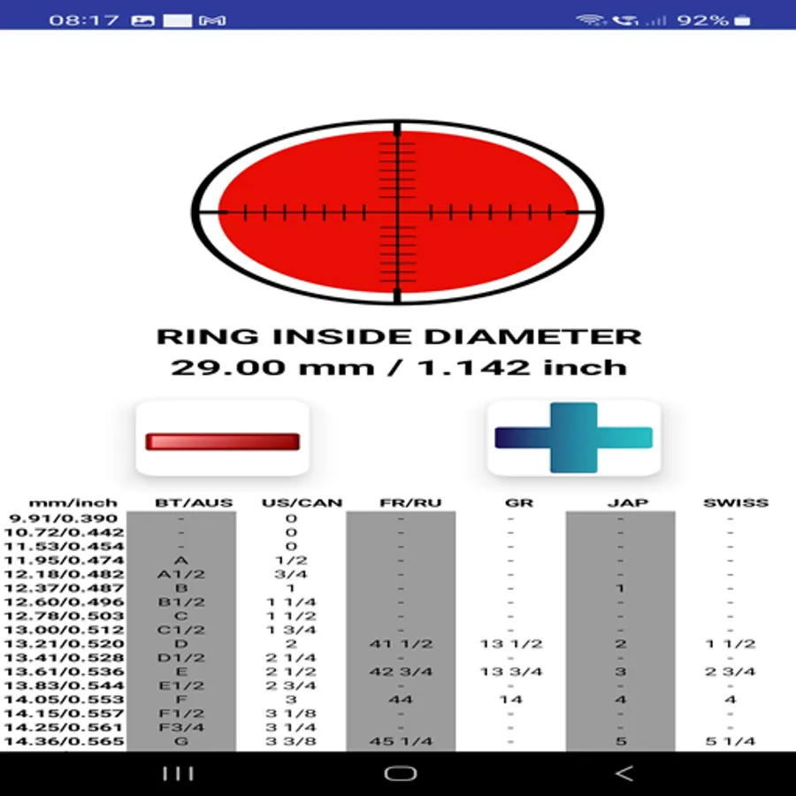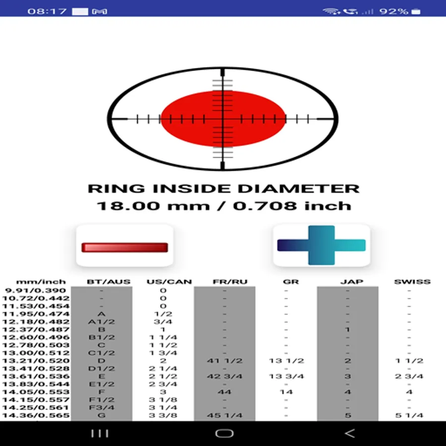 Simply placing the ring on the marked circle and adjust the red circle until it matches the ring. The app will calculate the rings diameter in millimeters and inches