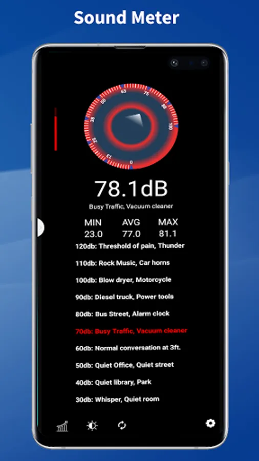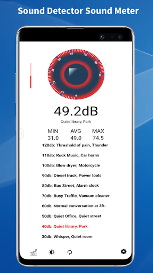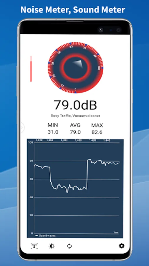 Sound detector and noise meter uses the phone built-in microphone for measuring the volume of sound in decibels(dB) and the graph is used to show the continuous changes in measuring the sound and noise.