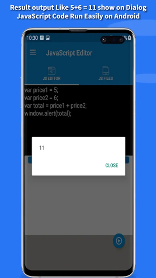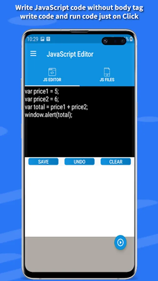 Welcome to JavaScript editor & Viewer app for learning java script code very easily. The app is offline and doesn’t need any network connection to run the code. The app is specially created for the purpose of learning java script without using computer system. JavaScript editor/IDE is specially offered for those who doesn’t have laptop/desktop computer system. The app could easily be used to run your JS code.