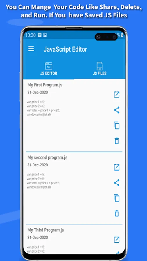 • All your saved program will be listed in the JS FILES screen.