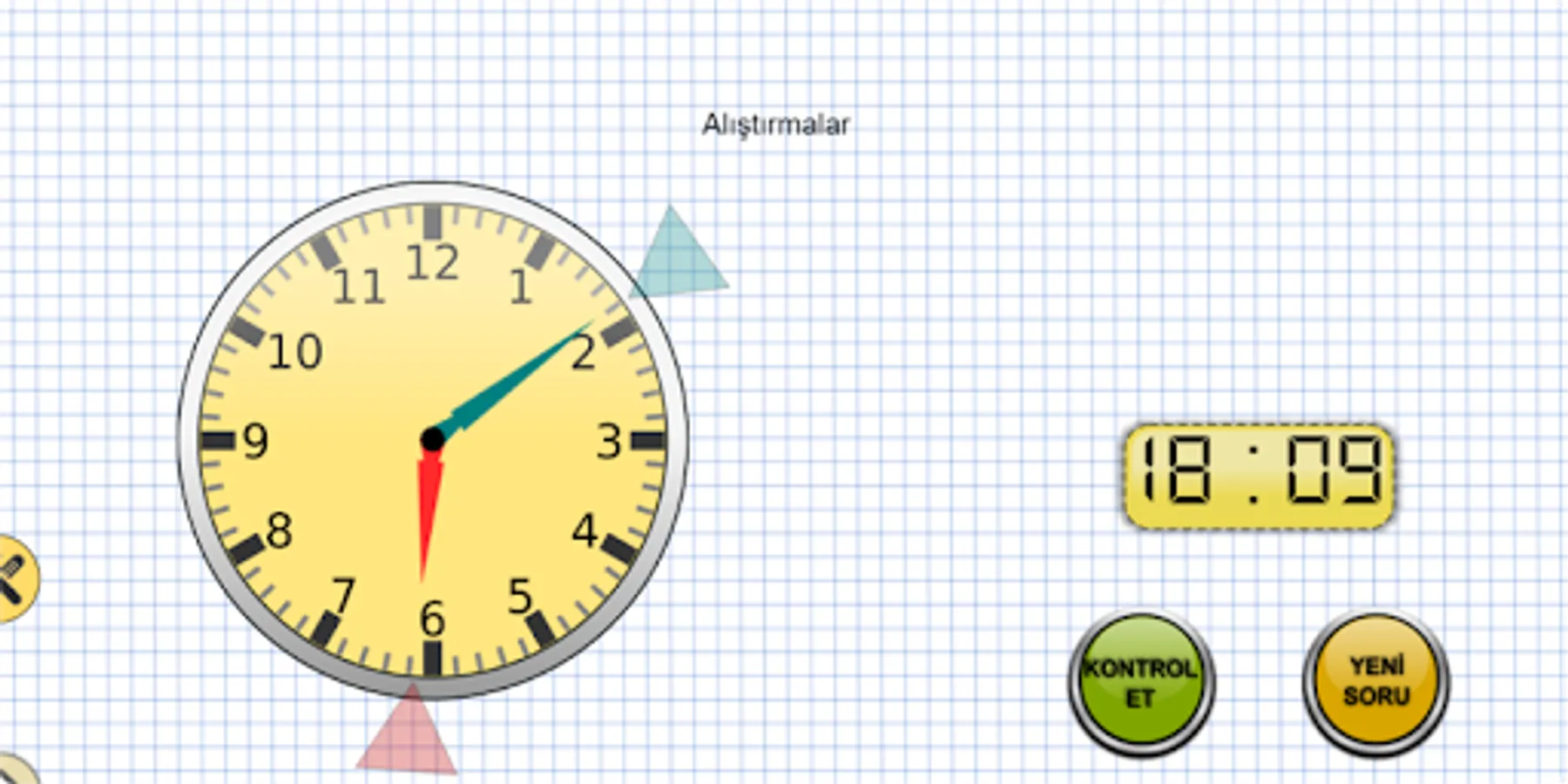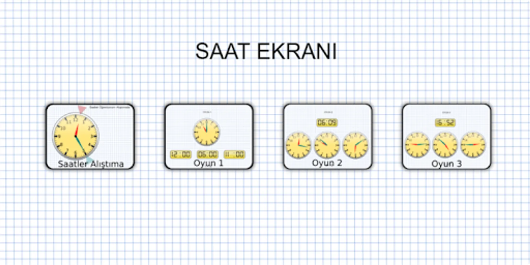 The Clock Screen app has been developed to suit all grade levels. It was developed in parts as whole hours, half hours, quarter hours, five minutes, and whole minutes. It can be used in all grades starting from the 1st grade of primary school.
