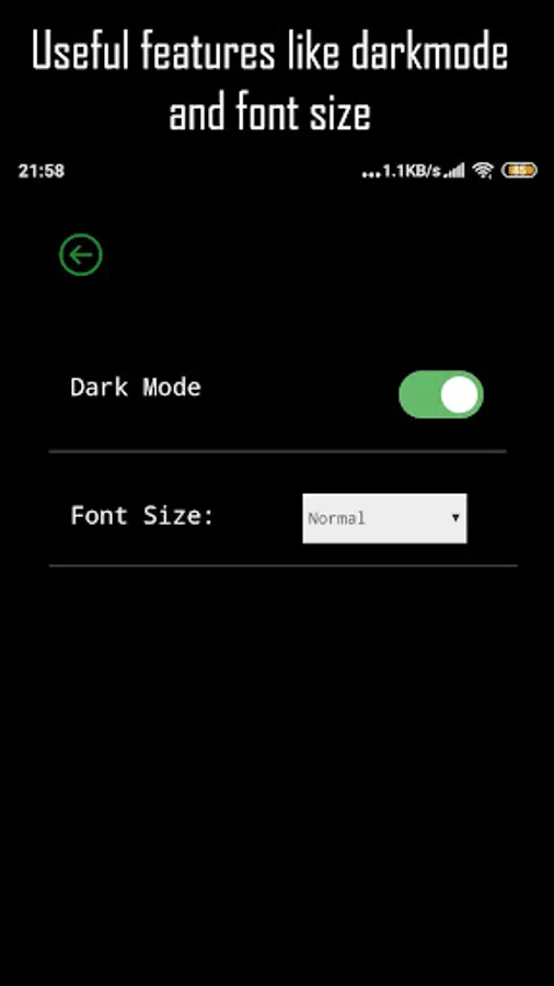 The app has a clean UI design and contains useful features like dark mode and text size selector.