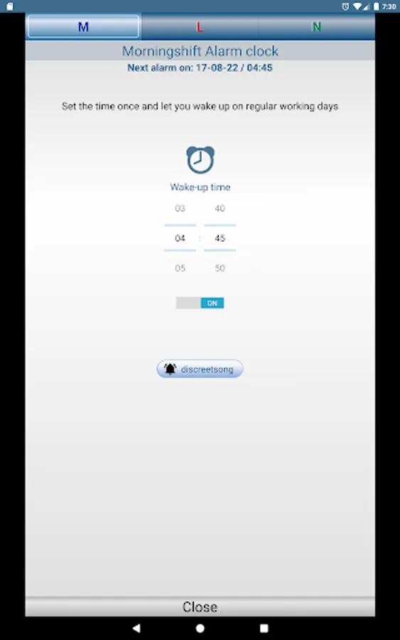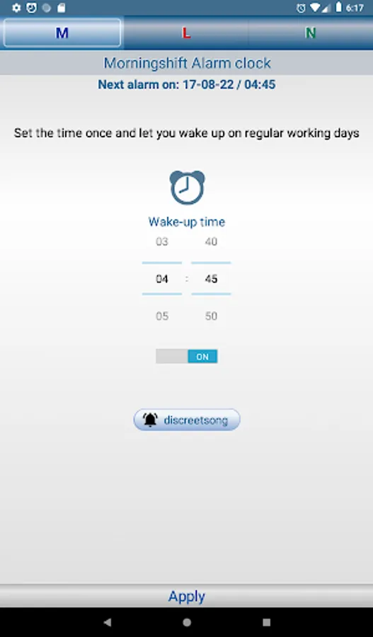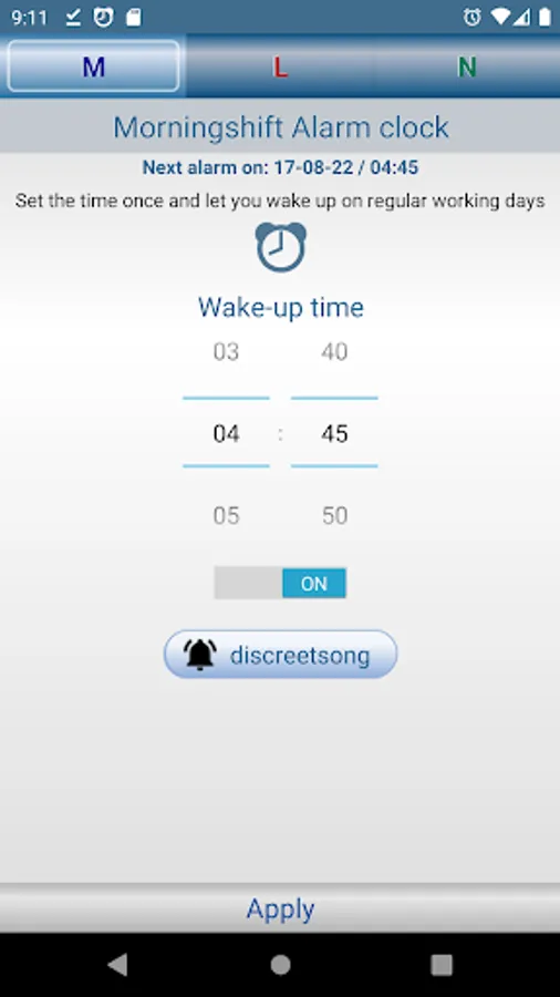 Depending on the work shift, set the time once and let it wake you up on regular working days.