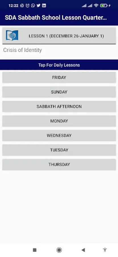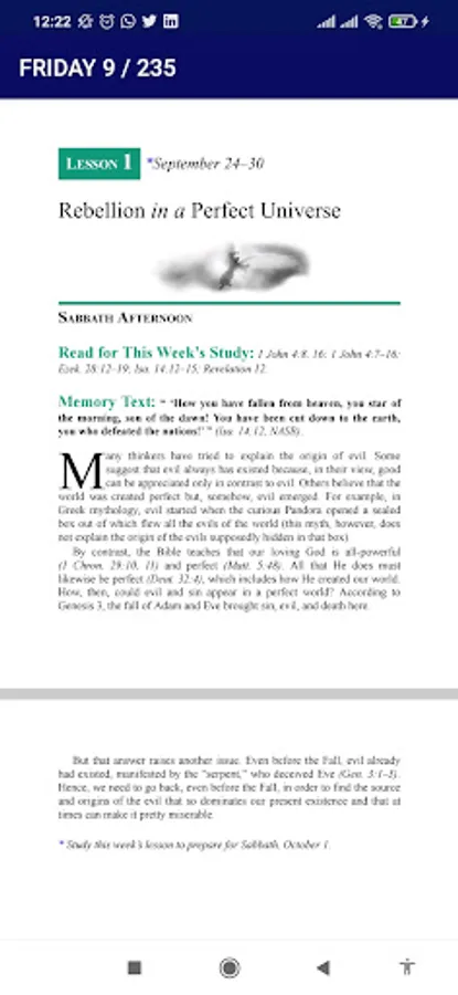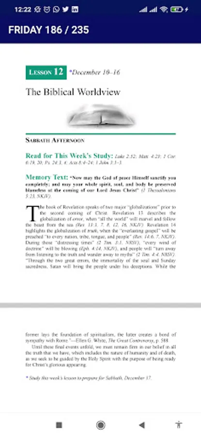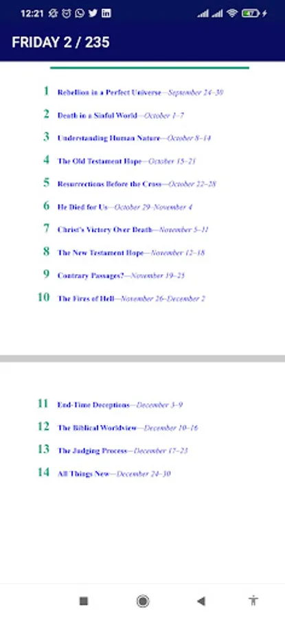 Sabbath School Quarterly app allows you to take your Seventh-Day Adventist Biblical studies wherever you bring your phone. Most Seventh-Day Adventist churches teach on the same topic or reading in a given week, as each quarter of the year has a different theme that reflects Bible, doctrinal, or church lifestyle teachings. Thus the lesson booklet is called quarterly.