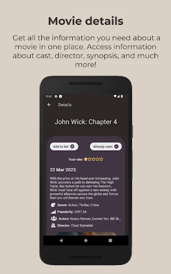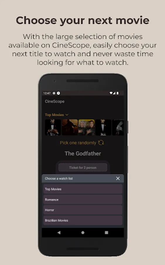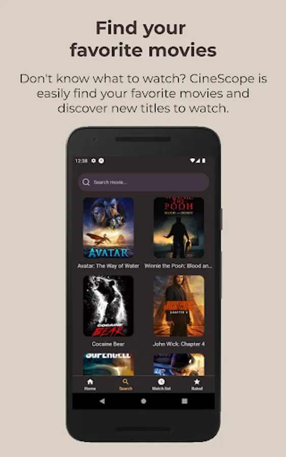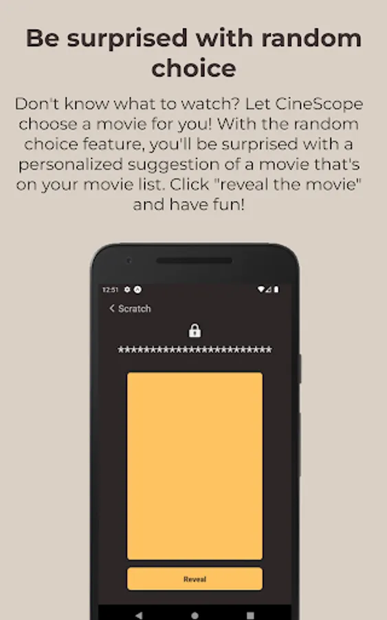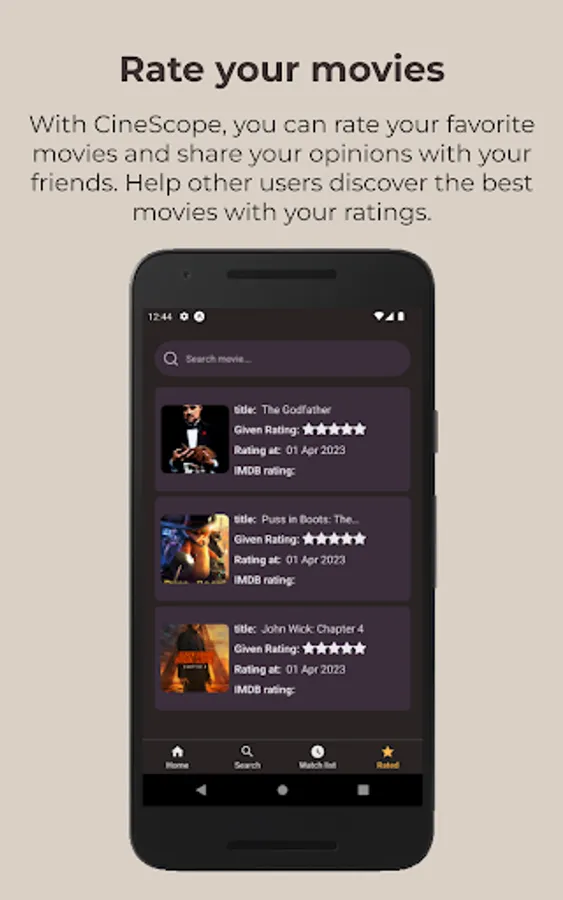 CineScope is the ultimate movie discovery and rating app, designed to help movie lovers create personalized movie lists, rate their favorite films, and discover new movies to watch. With CineScope, users can easily browse through a vast collection of movies, read reviews, and rate them based on their personal preferences. The app also offers personalized recommendations based on a user's movie preferences and viewing history. In addition, CineScope includes a unique feature that allows users to randomly choose a movie from their personalized movie list. Whether you're looking for the latest blockbusters or hidden gems, CineScope has got you covered. So download CineScope today and start exploring the exciting world of movies like never before!