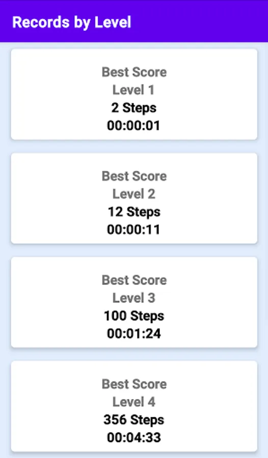 At each level solved, the best marks of time and number of steps used to solve the challenge are computed.