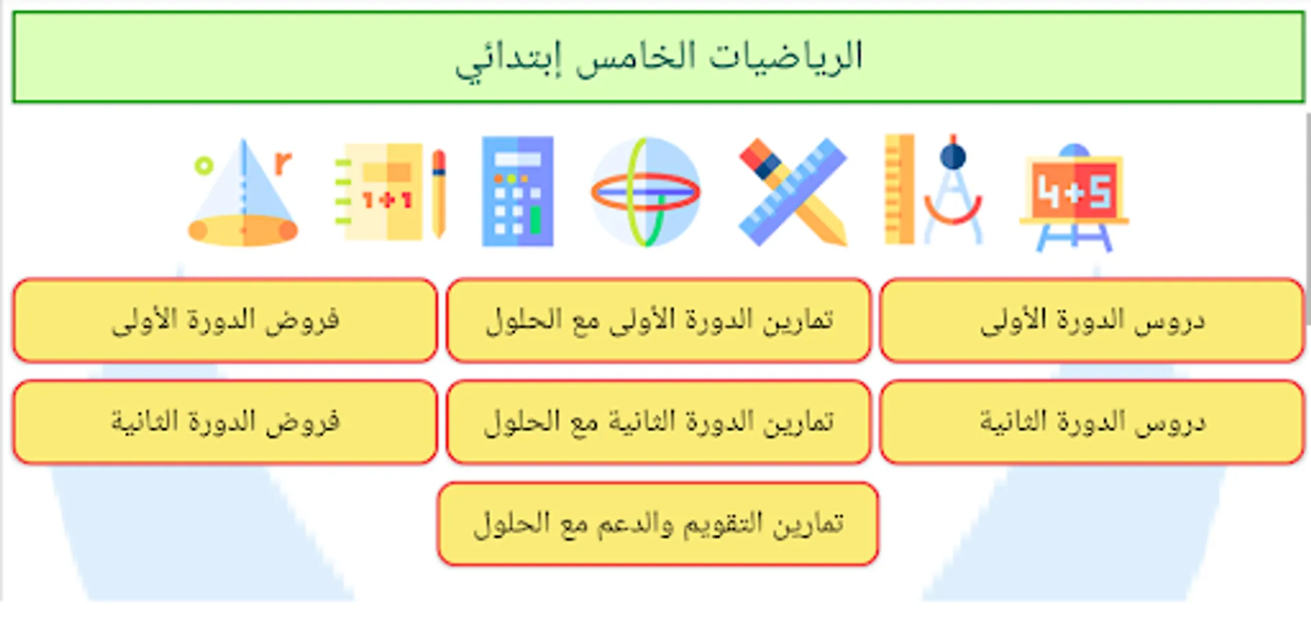 This application contains the lessons of mathematics for the fifth primary, summaries of all lessons, previous exams with the solution without the Internet.