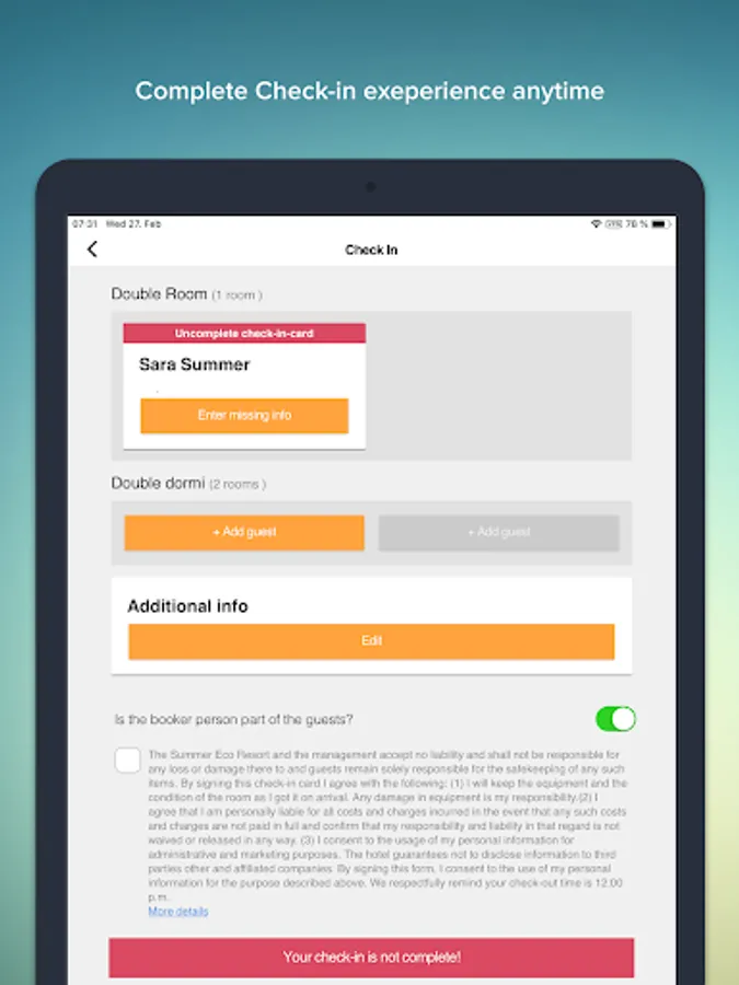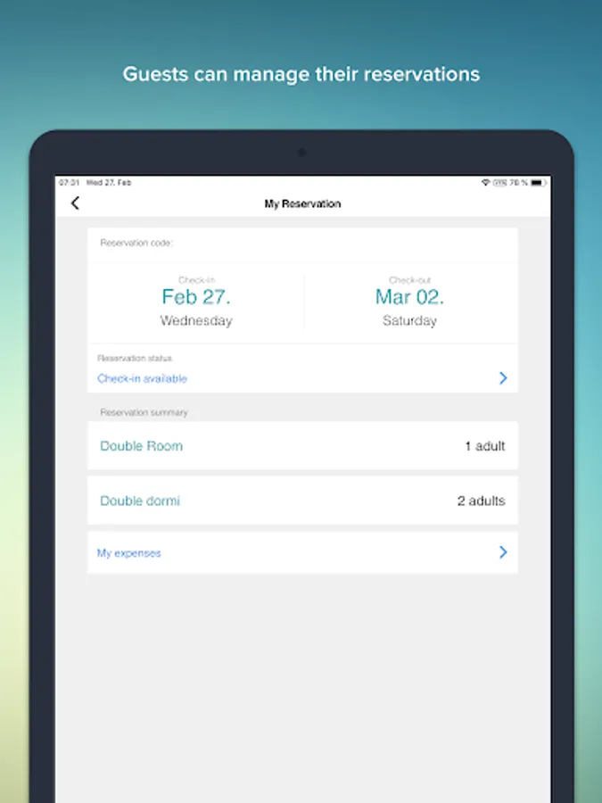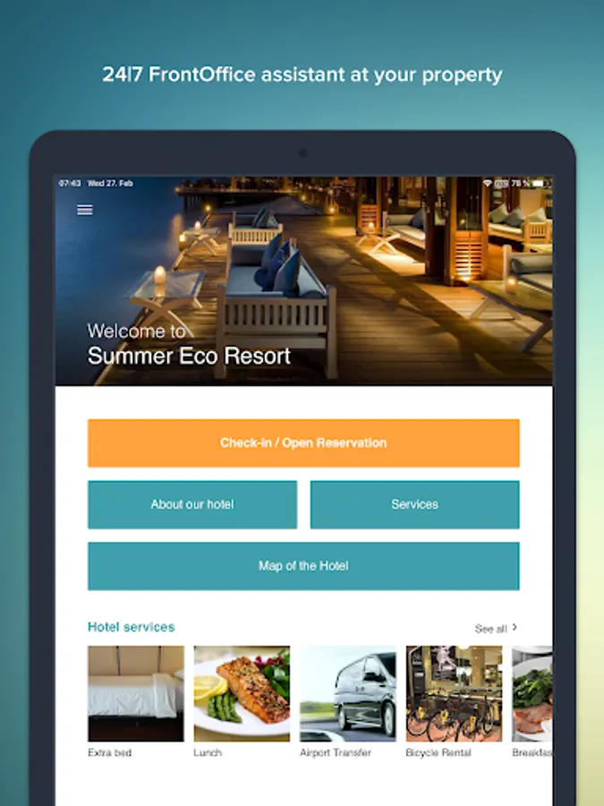 * Check-in 24|7: no more waiting at reception, check-in on a tablet