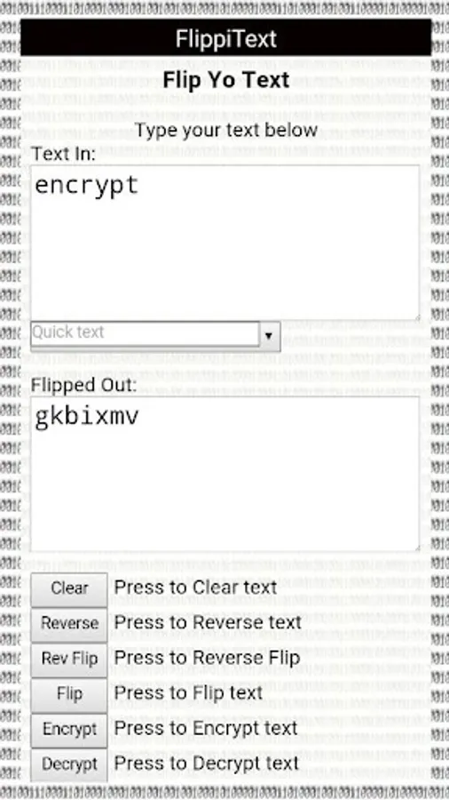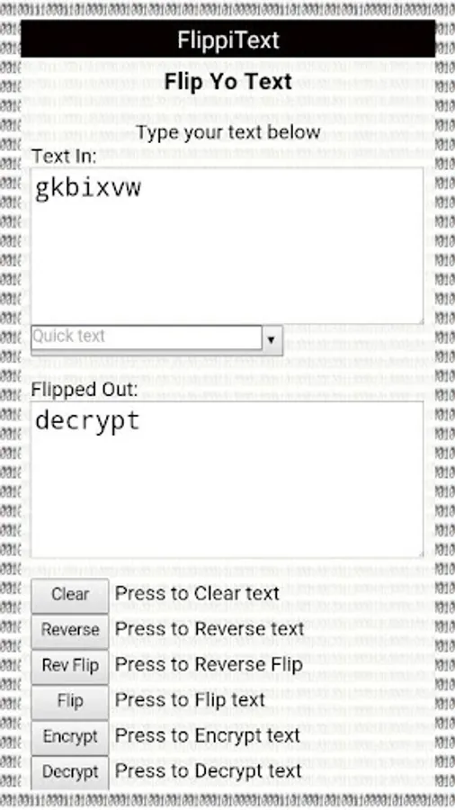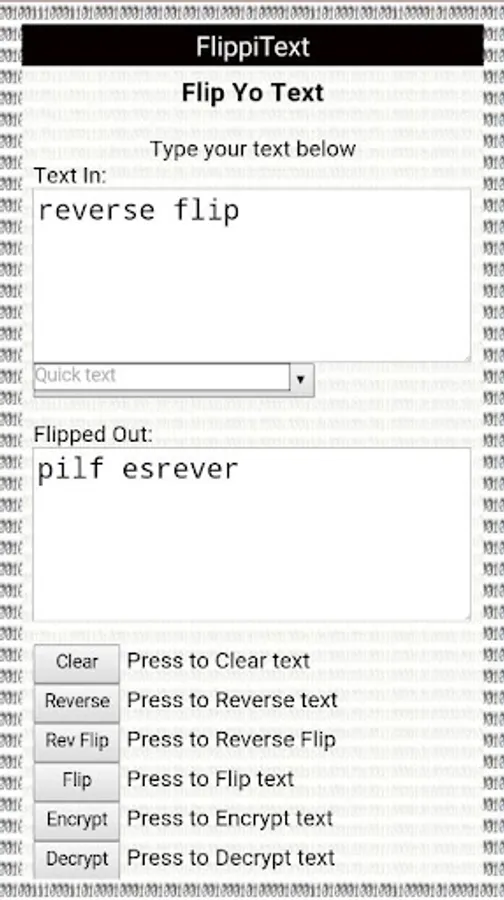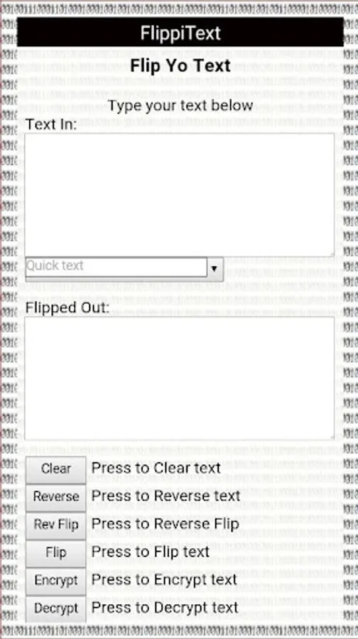 FlippiText will allow you to send messages that are flipped, reverse flipped, reversed and low level encrypted. The receiver will be able to decrypt text sent to them by FlippiText. This application does not collect any text being used within it. All text are available on your device only and is not shared with any other clients. You do not need network connection to use FlippiText.