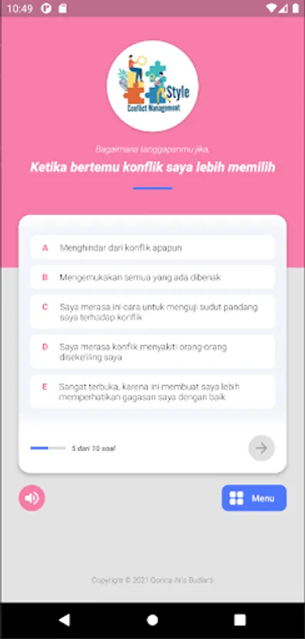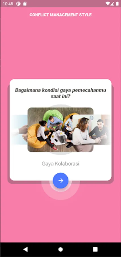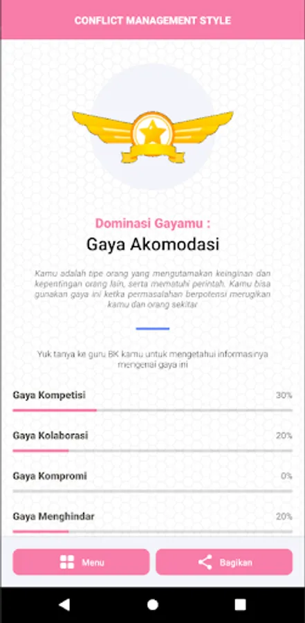 The above conflict management styles expressed by Cooper (2014) serve as the basis for researchers to develop an android CMS (Conflict Management Style). Knowing the style of managing conflict and understanding it is important for high school students, regarding the role and duties of BK teachers in the process of student development at school. With android CMS (Conflit Management Style) it is expected that students can understand various styles of managing conflict, which can then be applied in everyday life.
