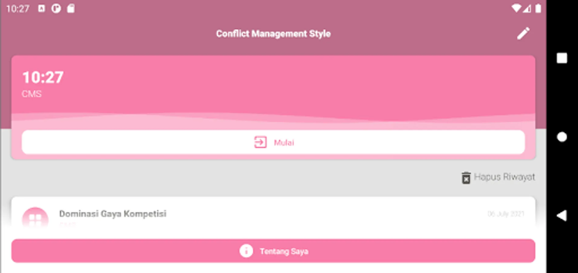 This Android-based CMS (Conflict Management Style) is needed as a way of providing information and understanding and efforts to reduce a conflict. This CMS (Conflict Management Style) android application contains several statements (conflict conditions) with several choice options (conflict management style) which later on each option option (conflict management style) displays the skills that need to be possessed in overcoming the conflict, android CMS was developed and adapted with the conditions in Indonesia, especially the research subject environment.