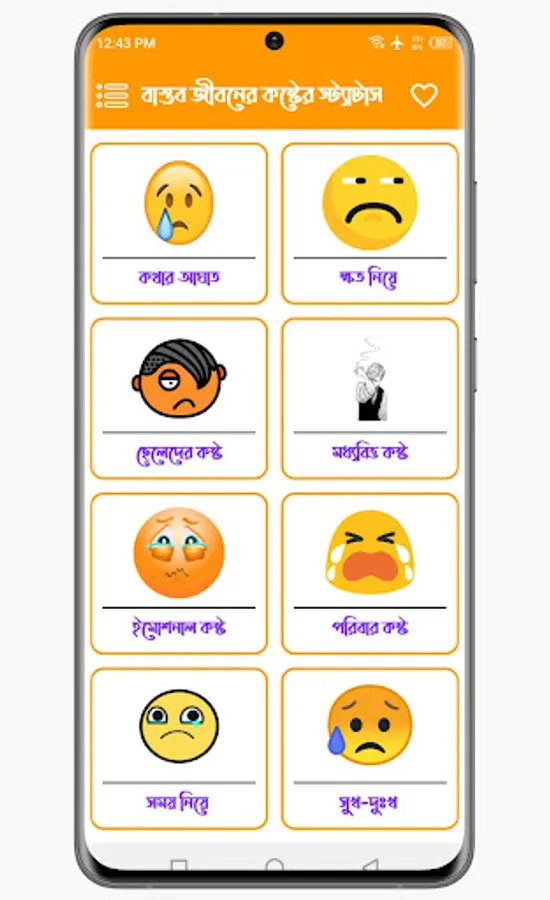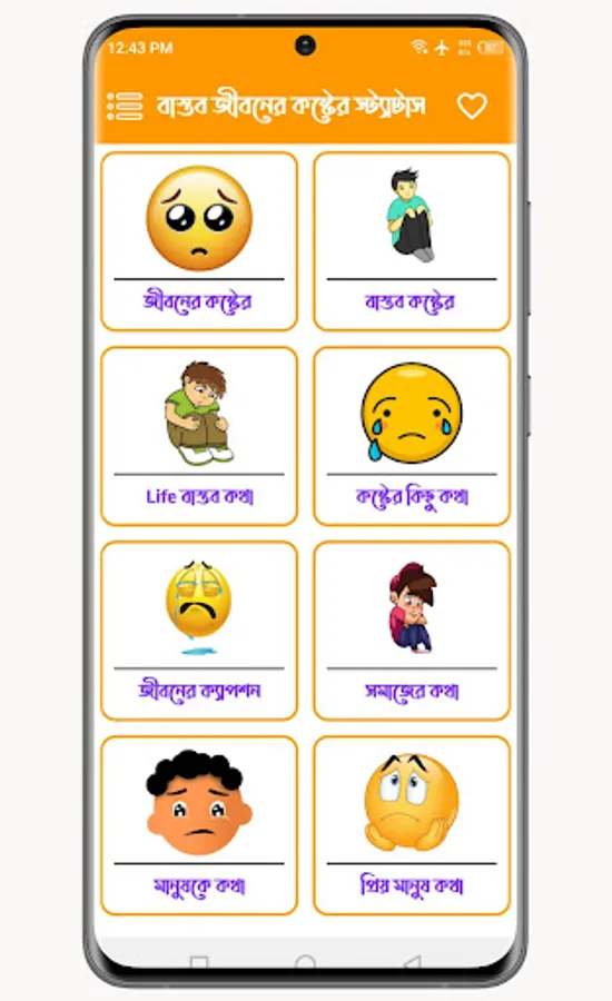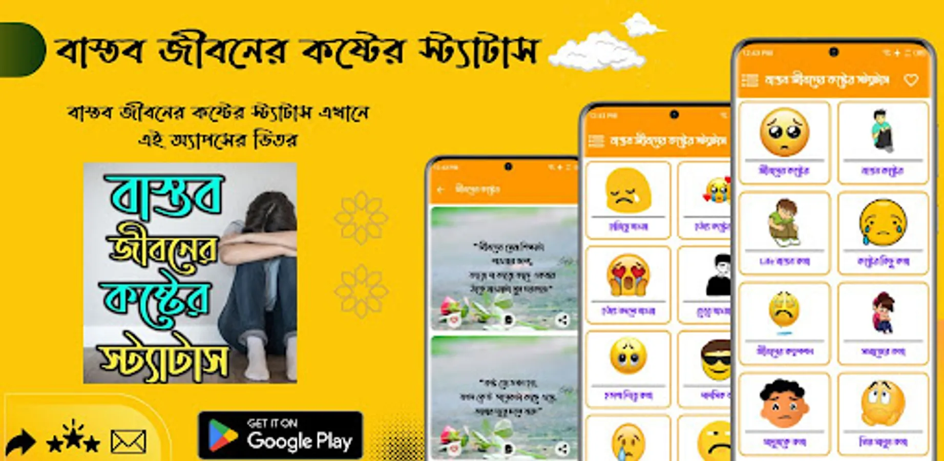 অ্যাপসটির ভিতরের বিষয়গুলো: স্বজন হারানো কষ্টের এসএমএস, কষ্টের জীবন, কষ্টের ছন্দ, আবেগি কষ্টের এসএমএস, রোমান্টিক কষ্টের এসএমএস, বন্ধুত্বের কষ্টের এসএমএস, বিরহের কষ্টের এসএমএস, পারিবারিক কষ্টের এসএমএস, ভালোবাসার কষ্টের এসএমএস, নাপাওয়া কষ্টের এসএমএস, অভিমানী কষ্টের এসএমএস।, বুক ফাটা কষ্টের এসএমএস, কষ্টের status, জীবনটা বড় কষ্টের।