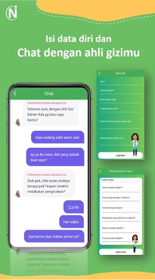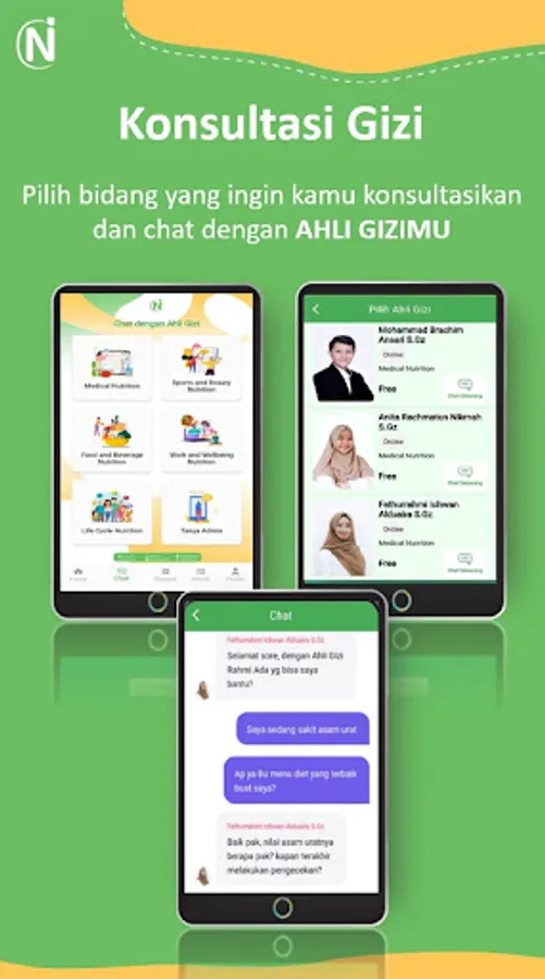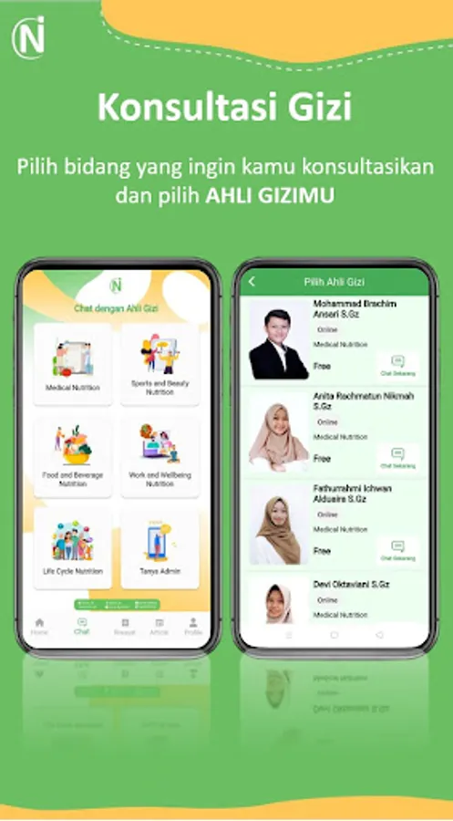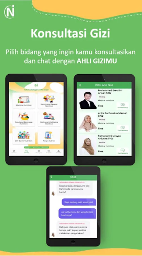 Nutrition consultation is a chat feature with our nutritionist, this feature can be used according to user needs, this feature allows users to choose the specialization in the field of nutrition that they want to consult: