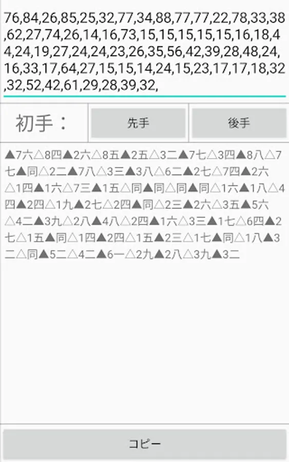 By inputting the sign of shogi as an arithmetic numeral, an appropriate code string is generated. You can also copy the code string to the clipboard.