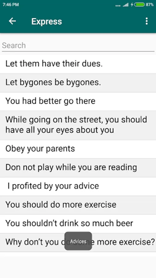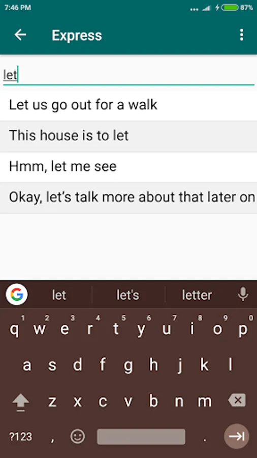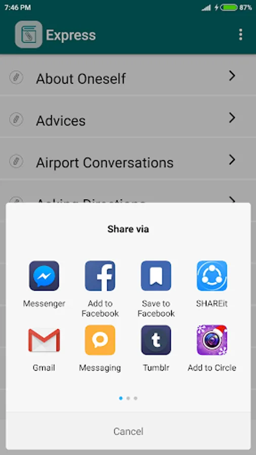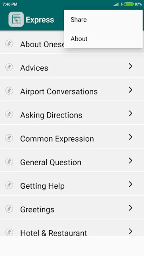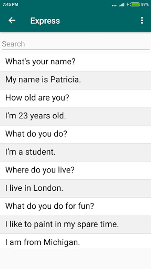 Express is an educational (language learning) application which provides commonly used expressions on various conversation topics such as Shopping conversation, Airport conversation, etc. This application helps to improve English speaking for non-native speakers.