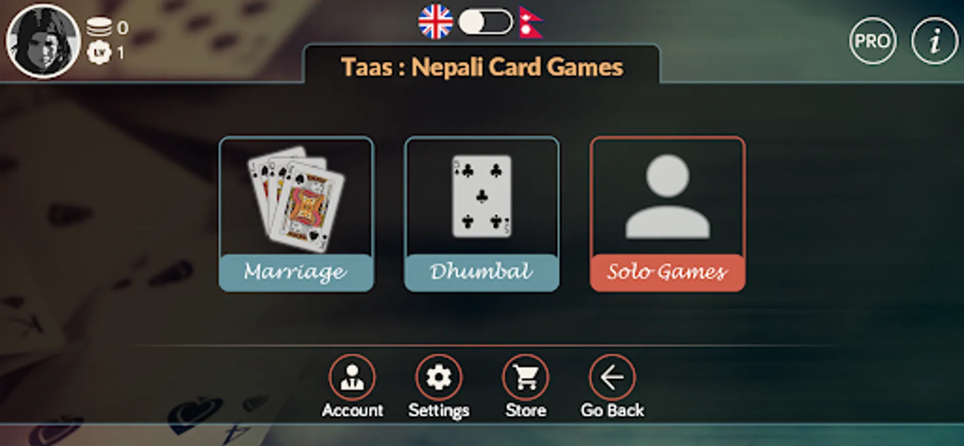 Nepali Card Games is a collection of some of the finest card games played by Nepalese Community all over the world. Currently It contains Marriage, Call Break, Teen Patti, Dhumbal, In Between and Jut Patti Card Games.