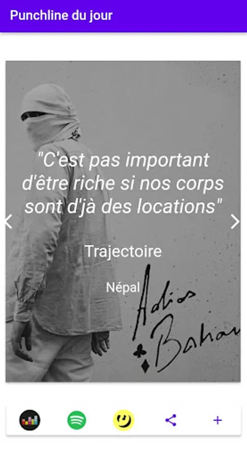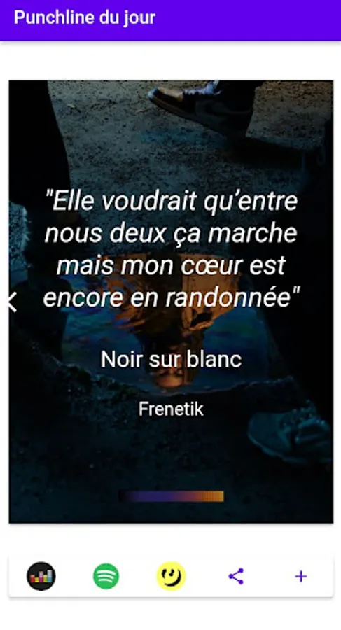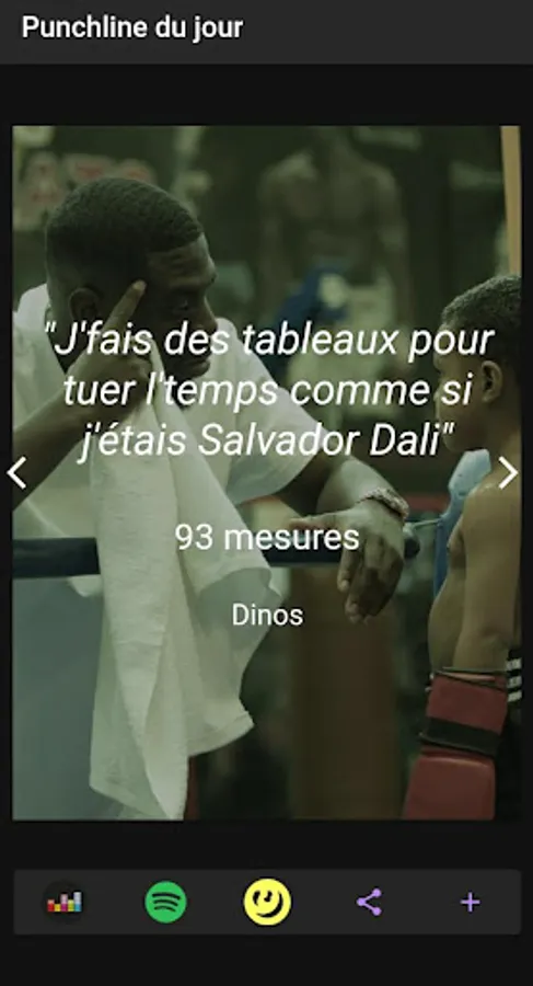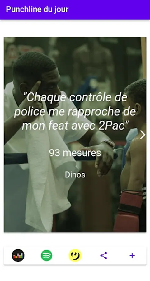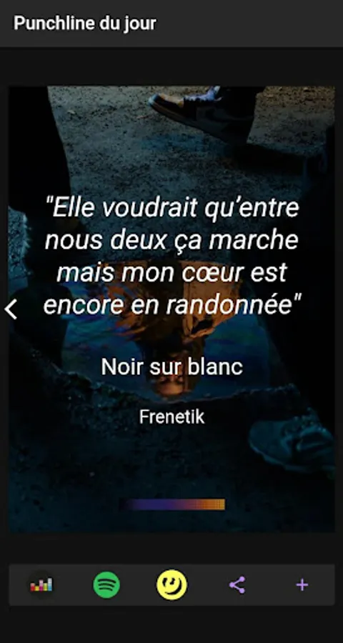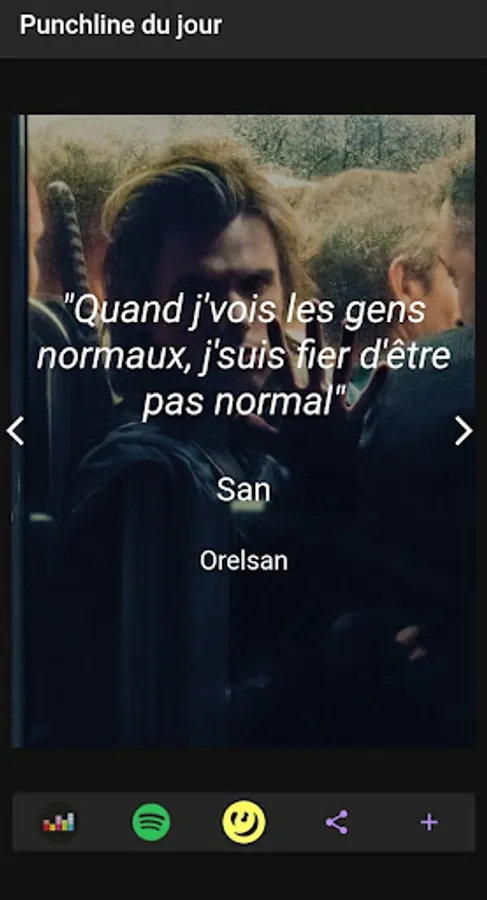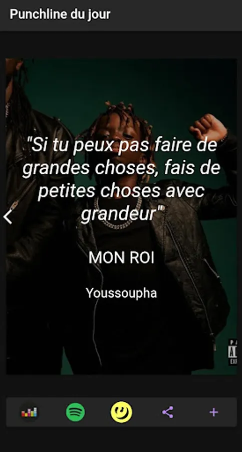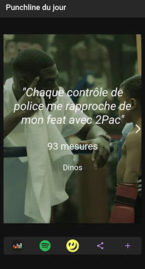 You can find for each punchline: a link to the title on Deezer and Spotify, a link to see all the lyrics and their analysis on Genius and a button to share your favorite quotes with your friends.