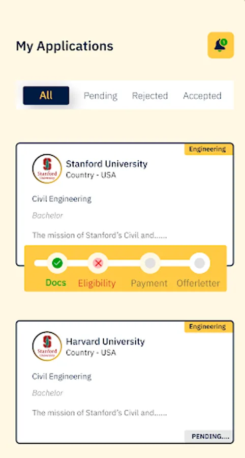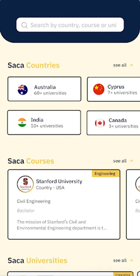 students apply for universities that are outside their countries. With the app, students are able to register and login, explore courses and universities, upload their documents and wait to be contacted about their applications. The app has more than 2000 courses in more than 250 universities in more than 30 countries around the world. Being available in most of the platforms, SACA is on the way to remove the gap between universities and students by acting as a technological bridge between these two parties.