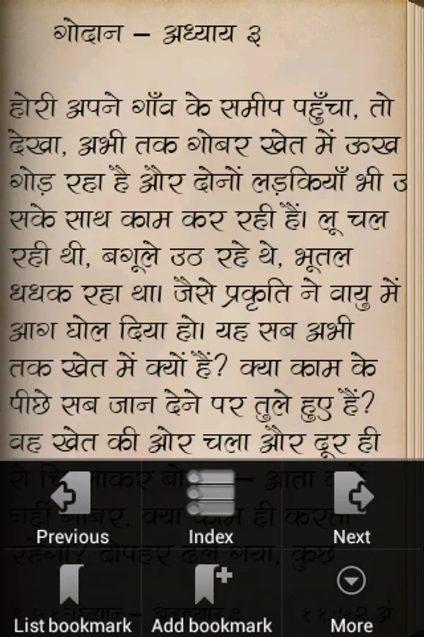 It was first published in 1936 and is considered one of the greatest Hindustani novels of modern Indian literature. Themed around the socio economic deprivation as well as the exploitation of the village poor, the novel was the last complete novel of Premchand. It was translated into English in 1957 by Jai Ratan and P. Lal translation; a 1968 translation by Gordon C. Roadarmel is now considered "a classic in itself".