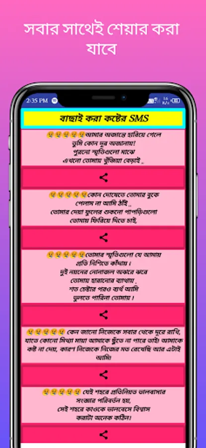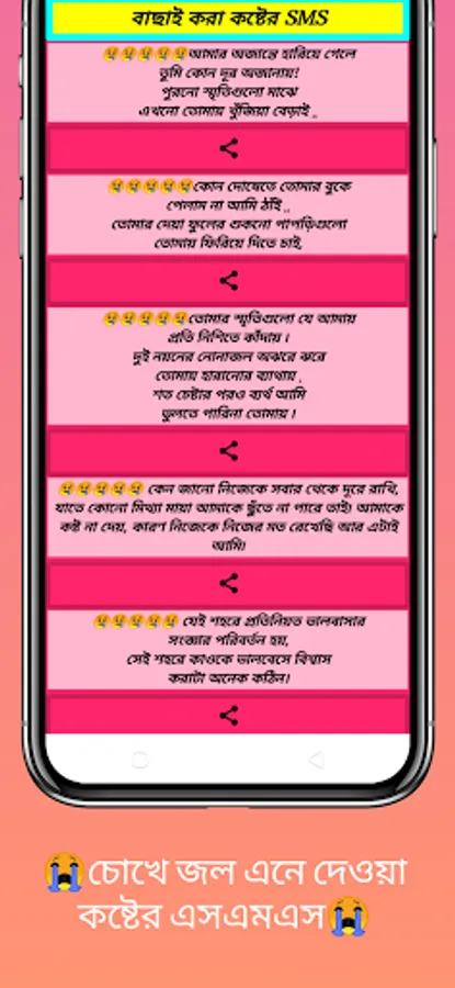 চোখে জল আনা কষ্টের SMS-Breakup Sad Shayari bengali-এই অ্যাপ থেকে খুব সহজেই যেকোন ধরনের দুঃখ ভরা ,কষ্টদায়ক এসএমএস /শায়েরী কবিতা/ ছন্দ /ছড়া পাওয়া যাবে | পুরোপুরি ফ্রি | বিনা ইন্টারনেট কানেকশনে এটি চলবে | সকলের সাথে এসএমএস শায়েরী কিংবা ছড়াগুলি শেয়ার করা যাবে | অনেক ধরনের এসএমএস একত্রে সংগ্রহ করা আছে খুবই কম সাইজ |