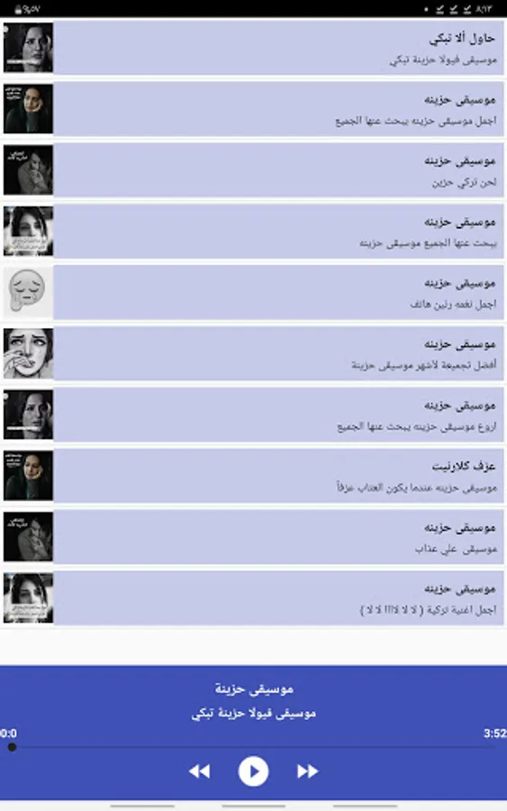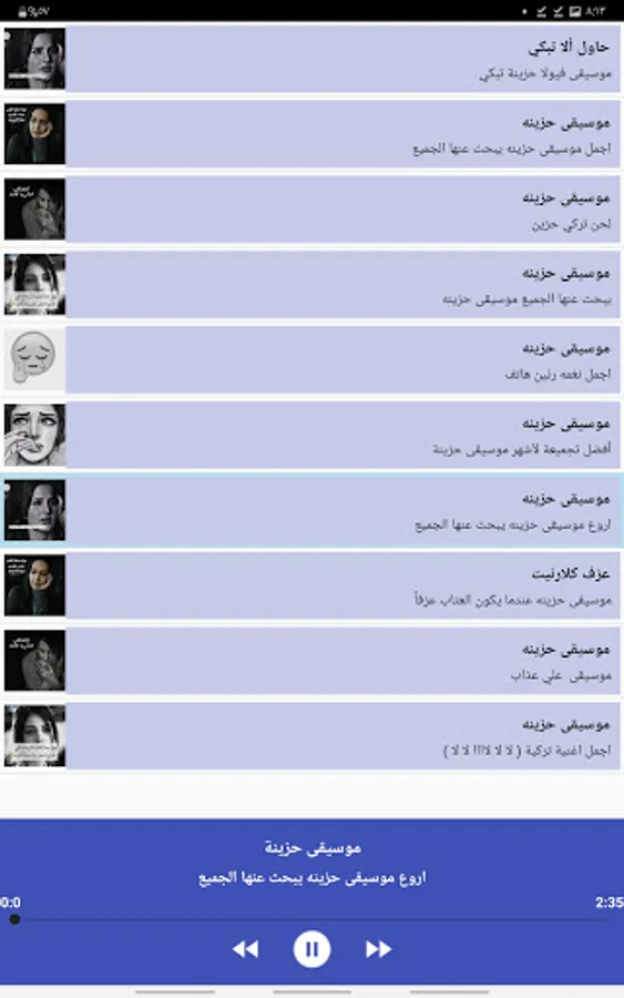 The application of sad music - sad ringtones - sad tones without the net provides a simple and modern design and arranged music where you can play music in the background and without the need for an Internet connection, as well as the application does not need a large memory on the phone.