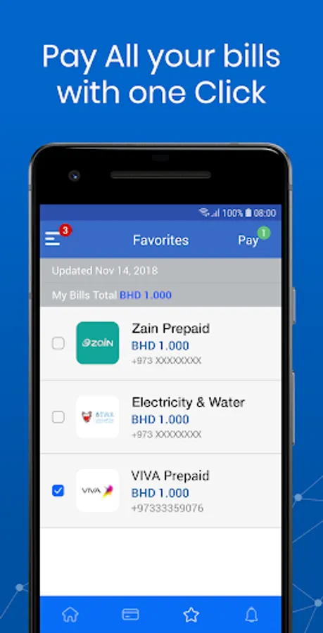 Make all your payments anywhere you are, anytime you want using SADAD's mobile app. SADAD's kiosk is now in your phone, allowing you to quickly make your payments on the go. You can pay for your phone, internet, and electricity and water bills, or you can recharge your prepaid lines.