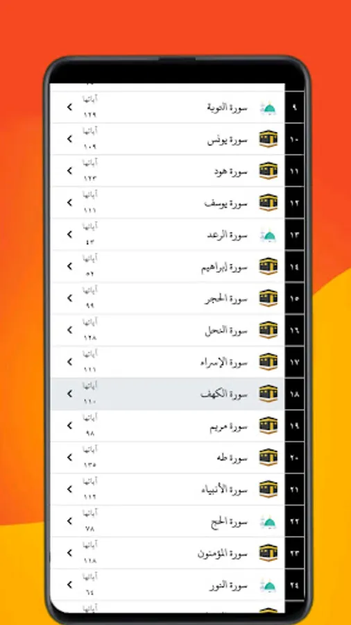 An index that includes the order of the Holy Qur’an surahs.