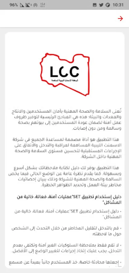 This application is a tool designed to help everyone in the Libyan Cement Joint Stock Company to monitor, intervene and agree on future actions to improve the level of occupational safety and health within the company.