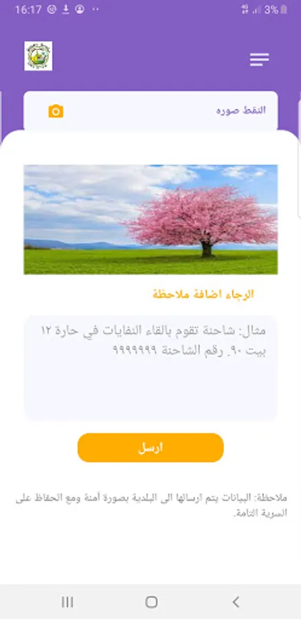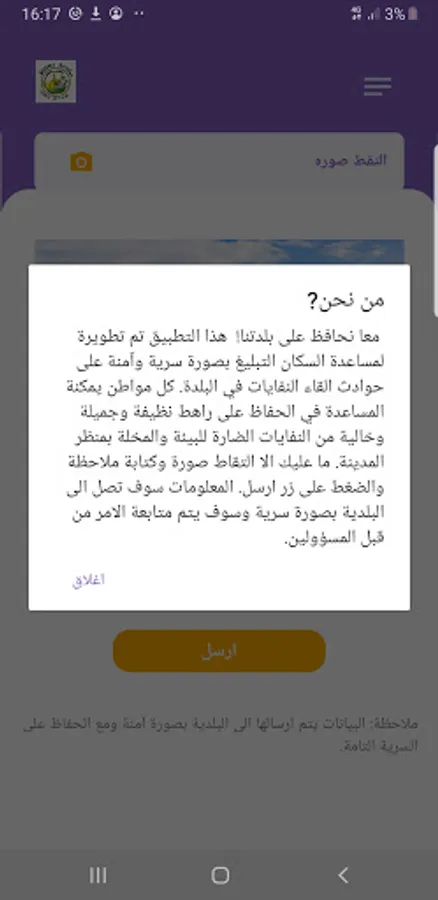 This application was developed to help residents confidentially and safely report incidents of littering in the town. Every citizen can help keep Rahat clean and beautiful and free from harmful waste for the environment and disturbing the cityscape. All you have to do is take a picture, write a note and hit the send button. The information will reach the municipality confidentially, and the matter will be followed up by the officials