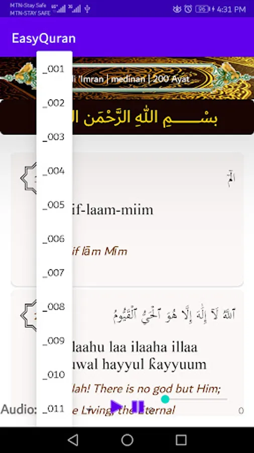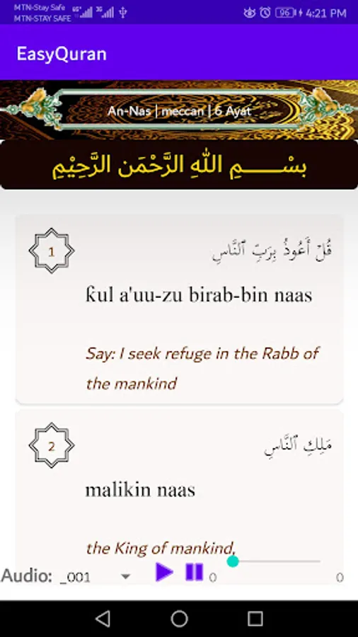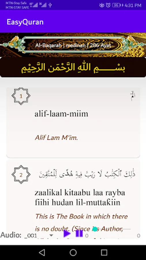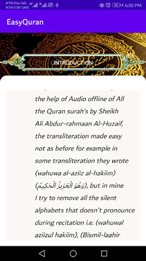 In the name of Allah, the Compassionate, the Merciful. The Easy Quran app design to help those who didn’t understand Arabic well to learn how to read Holy Quran almost fluently with the help of Audio offline of All the Quran surah’s by Sheikh Ali Abdur-rahmaan Al-Huzaif. the transliteration made easy not as before for example in some transliteration they wrote (wahuwa al-aziiz al-hakiim) (وَهُوَ الْعَزِيزُ الْحَكِيمُ), but in mine I try to remove all the silent alphabets that doesn’t pronounce during recitation i.e. (wahuwal aziizul hakiim), (Bismil-laahir Rahmaa-nir Rahiim). FOR INTERNATIONAL READERS PLEASE PAY ATTENTION: this is (ɗط - ) i.e. (ɗaطَ - ) (ɗiطِ - ) (ɗuطُ - ), (ɗanطً - ) (ɗinطٍ - ) (ɗunطٌ - ), (ɗuuطُو - ) (ɗawطَوْ - ) (ɗiiطِي - ) (ɗayطَيْ - ), (aɗɗaأَطَّ - ) (aɗɗiأَطِّ - ) (aɗɗuأَطُّ - ). This is (ƙق - ) i.e. (ƙaقَ - ) (ƙiقِ - ) (ƙuقُ - ), (ƙanقً - ) (ƙinقٍ - ) (ƙunقٌ - ), (ƙuuقُو - ) (ƙawقَوْ - ) (ƙiiقِي - ) (ƙayقَيْ - ), (aƙƙaأَقَّ - ) (aƙƙiأَقِّ - ) (aƙƙuأَقُّ - ). This is: (shش - ) i.e. (shaشَ - ) (shiشِ - ) (shuشُ - ), (shanشً - ) (shinشٍ - ) (shunشٌ - ), (shuuشُو - ) (shawشَوْ - ) (shiiشِي - ) (shayشَيْ - ), (ash-shaأَشَّ - ) (ash-shiأَشِّ - ) (ash-shuأَشُّ - ). Example of usage (ash-shayɗaanuاَلشَّيْطَانُ - ), (ƙawluقَوْلُ - ) if you understand these 3 alphabets (ɗط - ), (ƙق - ), (shش - ), then you can read, because they are the only differences from what you know. IMPORTANT THING TO KNOW; there are at least 5 places which found complex to write very well with transliteration they are as follows: (كَأَنَّمَا يَصَّعَّدُ) (ka-annamaa yas-sa'a'du) An-aam ch: 8, V: 125. (فَعَّالٌ لِّـمَا يُرِيدُ) (fa'a'aalun limaa yuriid) Huud ch: 11, V: 107 and also in occur in Al-buruuj ch: 85, V: 16. (وَلاَ تُصَعِّرْ) (walaa tusa'i'r) Luqmaan ch: 31, V: 18. (يَوْمَ يُدَعُّونَ) (yaw-ma yuda'uuna) Tuur ch: 53, V: 13. (يَدُعُّ الْيَتِيمَ) (yadu'u'ul yatiim) Tuur ch: 53, V: 13. I try my best but this is the only how I can write them, but with the help of audio which is offline you can manage to pronounce them well.