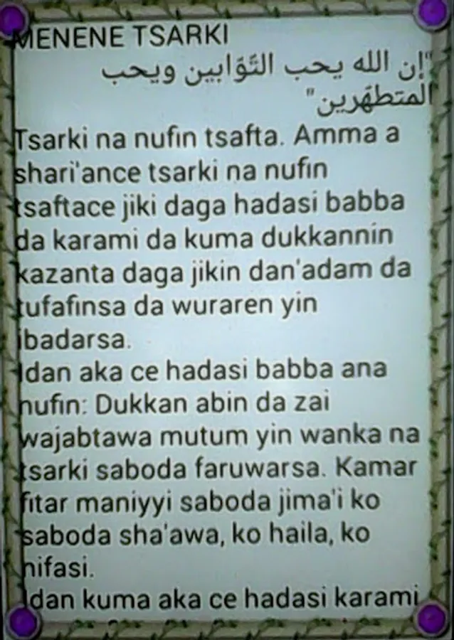 Godiya ta tabbata ga Allah Madaukakin Tsarki, Tsira da Amincin Allah su kara tabbata ga fiyayyen halitta Annabi Muhammad (SAW) bayan haka, Wannan dan littafi yana bayani ne game da tsarki a addinin Musulunci cikin harshen Hausa, domin amfanin Musulmi kasancewar wannan hanya mafi sauki wajen yada sako a cikin fadin duniya ga miliyoyin mutane, sabanin tsohuwar hanya ta buga littafi a rarraba shi, da fatan za’a samu Wani wanda zai dauki nauyin wannan aiki a matsayin Sadakatul Jariya domin cigaba da gudanar da wannan aiki na alkhairi ta yadda wata rana zai zamanto akwai tarin littattafai masu yawa cikin harshen Hausa. ina kuma aiki kan update a yanzu dan ya zama daidai da app di na, na Aikin Hajj da Umrah domin dada saukaka shi ga mai karatu.