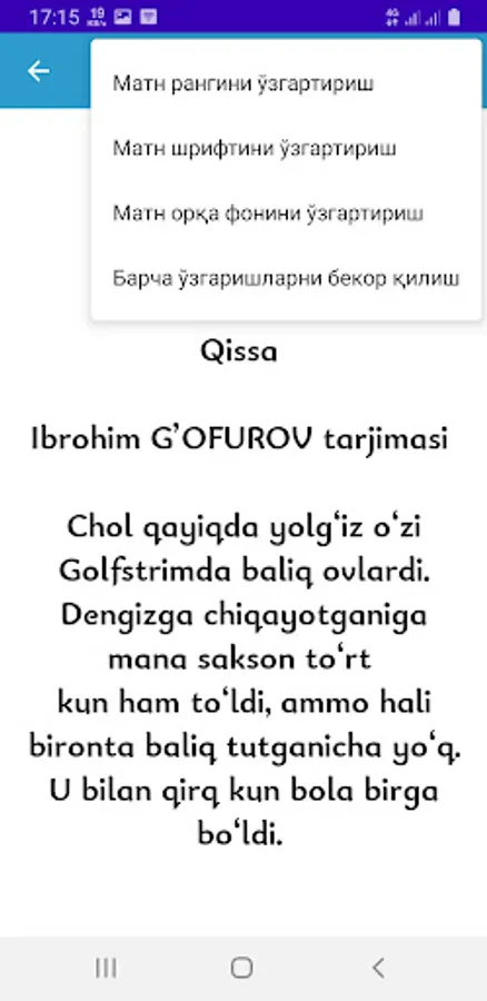 Chol qayiqda yolg‘iz o‘zi Golfstrimda baliq ovlardi. Dengizga chiqayotganiga mana sakson to‘rt