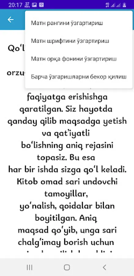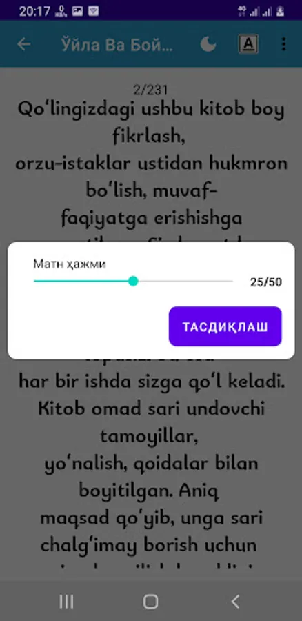 Ushbu kitob o'z oldiga maqsad qo'yishni, ishonch tuyg'usini mustahkamlashni, turli sinovlarni engib o'tishni, izlanishni o'rgatadi. Shuningdek, maxsus bilimlar, aql-zakovat, oldinga intilish haqida keng tushuncha beradi. Kitob boy fikrlash, orzu-istaklar ustidan hukmron bo'lish, muvaffaqiyatga erishishga qaratilgan. Siz hayotda qanday qilib maqsadga etish va qat'iyatli bo'lishning aniq rejasini topasiz. Bu esa sizga har bir ishda sizga qo'l keladi. Kitobda ko'plab insonlar hayotidan olingan ibratli misollar keltirilgan. Unda fikr kuchi, g'ayrat-shijoat, baxt-saodatga erishish yo'llari, muvaffaqiyatning oddiy sirlari bayon etilgan. Omad sari undovchi tamoyillar, yo'nalish, qoidalar bilan boyitilgan. Aniq maqsadni belgilab, unga tomon chalg'imay borish uchun nimalar qilish kerakligi muxtasar aytib o'tilgan.