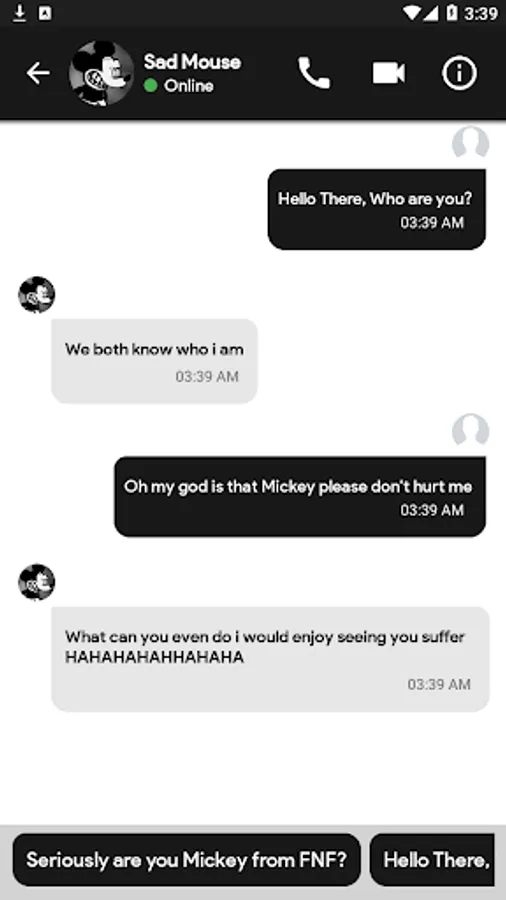 This joke application allows you to make a simulated chat and also allows you to send and receive messages from Horror Scary Sad Mouse FNF.