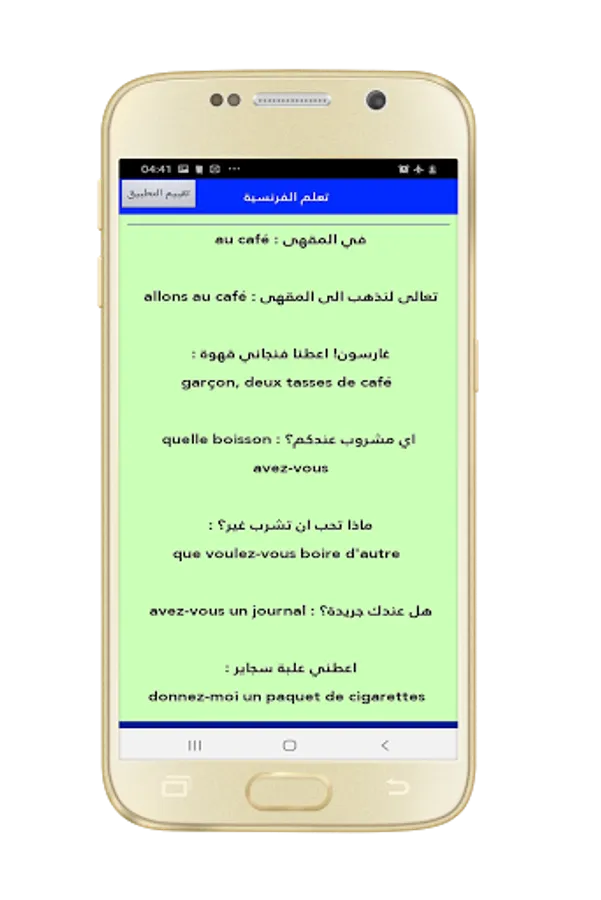تطبيق تعلم اللغة الفرنسية هو تطبيق شامل يحتوي على عدة أقسام وعدة محادثات مختلفة حسب الزمان والمكان كل هذا بالصوت لتسهيل التعلم وبدون انترنت كما يحتوي ايضا هذا التطبيق على طرق بسيطة سهلة وجديدة تسهيل التواصل إضافة الى نطق الكلمات.